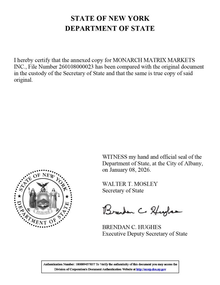 Monarch Matrix Markets Inc is a New York–registered quantitative fintech institution dedicated to the long-term study of global market structure.